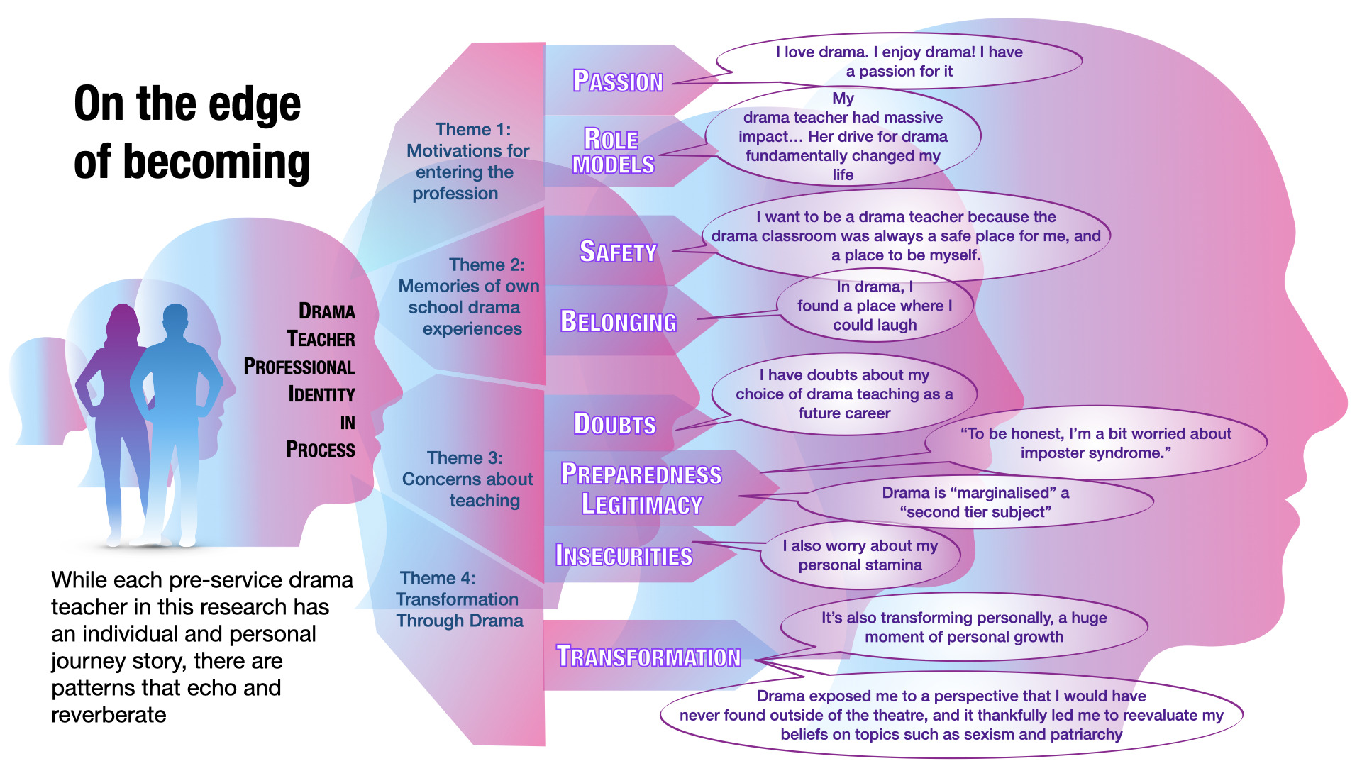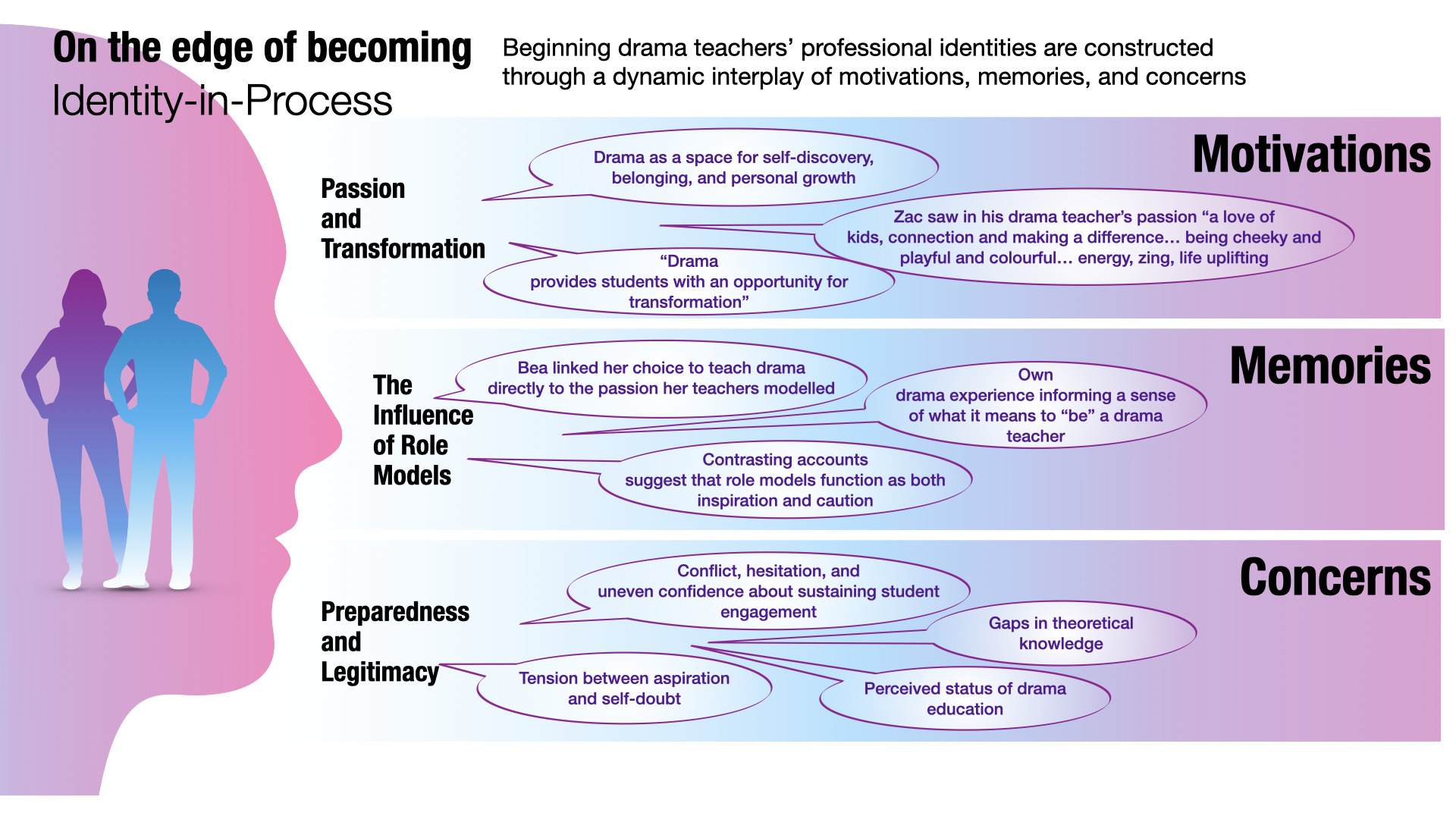 This study asked how pre-service drama teachers’ motivations, memories, and concerns inform the construction of their professional identity. We now interpret the themes identified in the findings in relation to existing research and theory, highlighting both alignments and tensions. The perceptions of 22 pre-service drama teachers reveal that identity formation is a layered process, shaped by passion for the subject, remembered experiences of teachers’ past, and concerns about preparedness and legitimacy. Their stories both affirm existing research on effective drama pedagogy and highlight gaps in how initial teacher education supports the development of confident professional identities.
